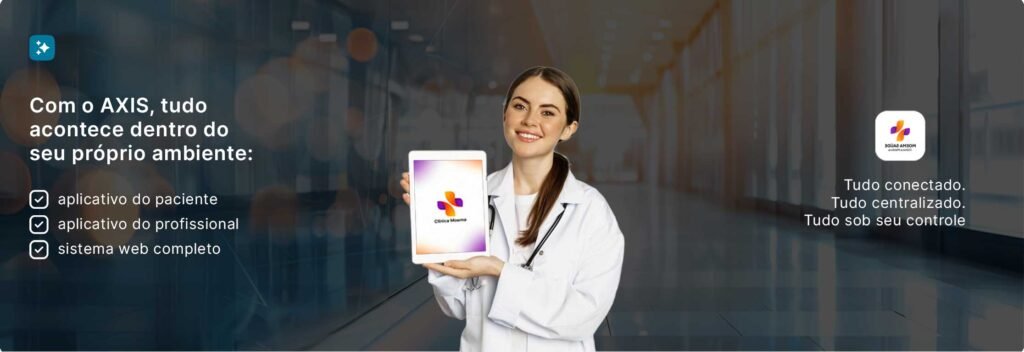 Todos os aplicativos AXIS são publicados oficialmente nas lojas Apple e Google com a identidade do profissional ou da clínica.